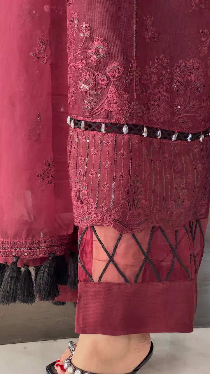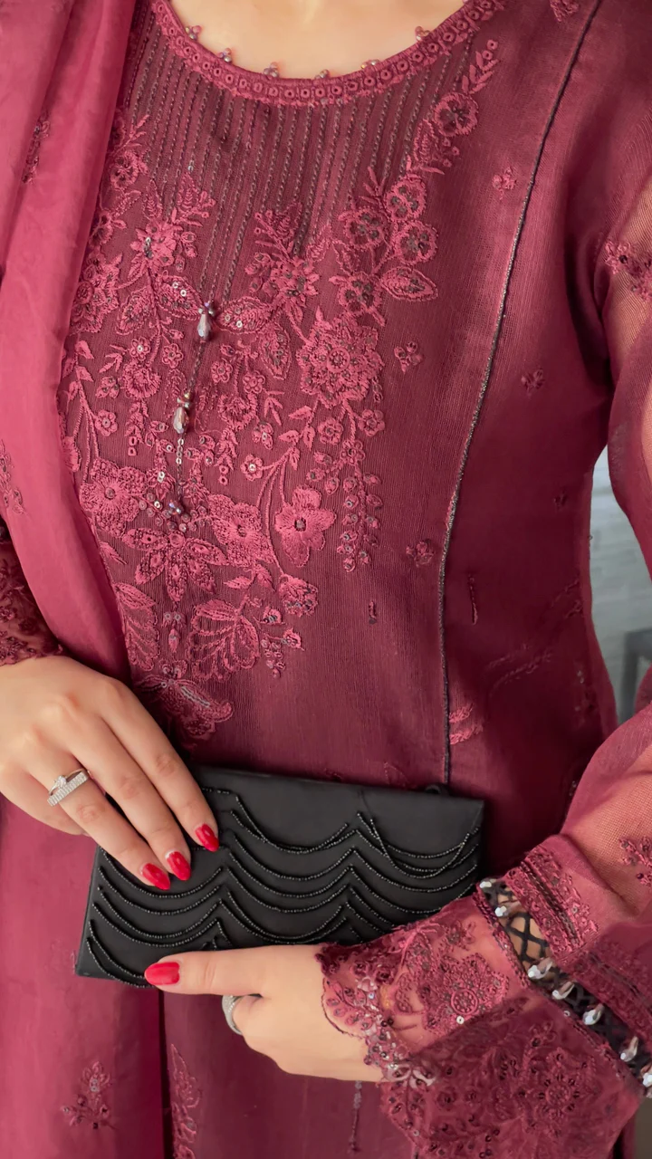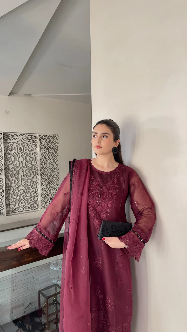 Elevate your wardrobe with this 3-piece Khadinet suit from Ayesha.B’s luxury collection. Crafted from premium Khadinet fabric, it features delicate embroidery work that adds elegance and sophistication. Perfect for festive occasions and formal gatherings